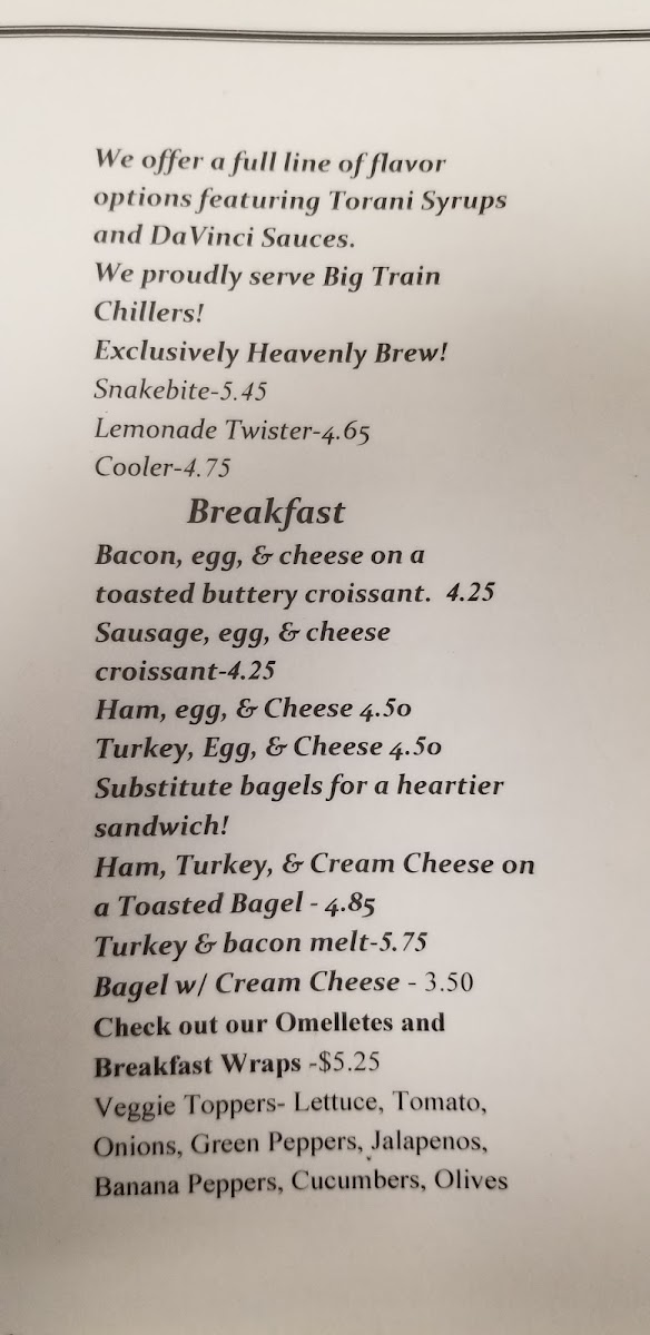 The menu at Heavenly Brew Cafe is thoughtfully curated, featuring offerings that promise to please any palate. Start your day off right with their delicious Bacon, Egg & Cheese or Sausage, Egg & Cheese, each priced at just US $4.25. These breakfast sandwiches are satisfying and made with high-quality ingredients, making them the perfect partner for your morning coffee. For something to cool down your day, indulge in their Blended Chillers, particularly the Blended Caramel or Blended Vanilla, both at US $4.65. Each sip is a creamy delight that makes it impossible not to smile!